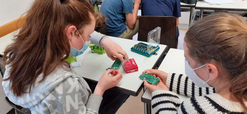 Während wir warteten, bis alle Schüler mit dem aktuellen Schritt fertig waren, durften wir einem 3D-Drucker zugucken, der auf dem Pult im Klassenzimmer stand, während er gerade kleine, grüne Mini-Roboter-Schlüsselanhänger produzierte.