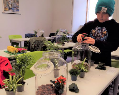In unserem Bio-Saal darf gerne ausprobiert und experimentiert werden. Die Klasse 5a nutzte die Zeit in der Natur und Technik-Übung dafür, eigene Gärten im Glas zu gestalten. Den Anfang dafür machte Blähton, der, nachdem er ordentlich gespült worden war, in große Einmachgläser gefüllt wurde. Als nächstes folgten die Pflanzen. Jedes Kind durfte sich die Pflanzen für den kleinen Garten selbst aussuchen und so das eigene Glas gestalten. Deckel zu – und fertig! Herausgekommen sind wunderschöne Glas-Gärten, die die Kinder mit nach Hause nehmen durften und an denen sie hoffentlich lange eine Freude haben können.