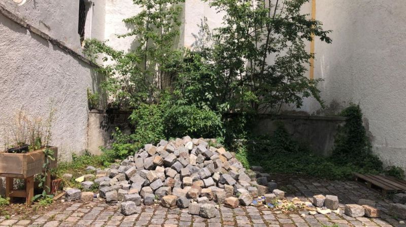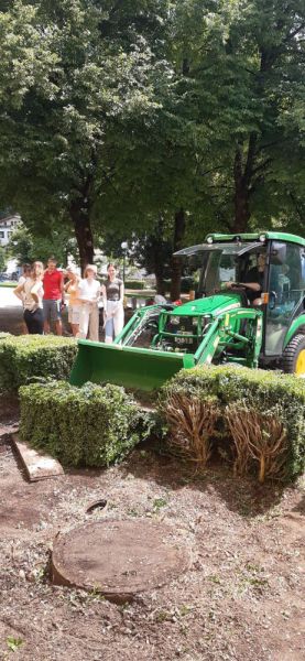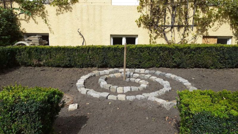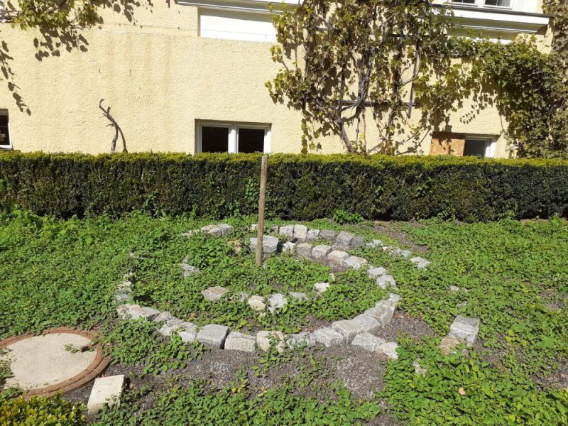 Nachdem nun alles komplett entfernt war, begann der Neubau! Konkret bedeutet das, die Grundsteine für die Vervollständigung unserer Arbeit im nächsten Schuljahr zu legen. Bevor die Schneckenform aus Pflastersteinen unter der Anleitung von Pauline, ihrer Entwerferin, Gestalt annehmen konnte, verteilten alle Seminarteilnehmer/innen die gelieferte neue Erde im Schulgarten. Dann wurden von allen Seminarteilnehmer/innen die Pflastersteine für unsere Kräuterschnecke herangeschleppt und anschließend an ihren vorgesehenen Plätzen in den Boden gesenkt. Nun planen wir schon, welche Kräuter ihren Platz im Schulgarten finden werden. Besonders wichtig ist uns, dass sie winterhart sind, damit die Schüler/innen der offenen Ganztagesschule, die sie für selbstgemachte Suppen und Salate verwenden können, lang etwas von unserer Arbeit haben werden.